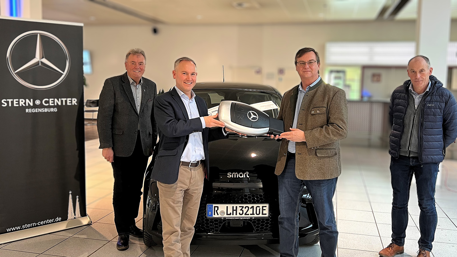 Das Mercedes-Benz Stern-Center Regensburg unterstützte das Projekt sehr gerne und übernahm rund 40 % des Kaufpreises. PKW-Verkaufsleiter Ulrich Schlammerl übergab jetzt im Stern-Center Regensburg das Fahrzeug an den Vorstandsvorsitzenden der Lebenshilfe e.V. Friedrich Weinbeck, der zusammen mit seinem Stellvertreter Hans Pollinger und Geschäftsführer Johann Halbritter in das Autohaus gekommen war.
