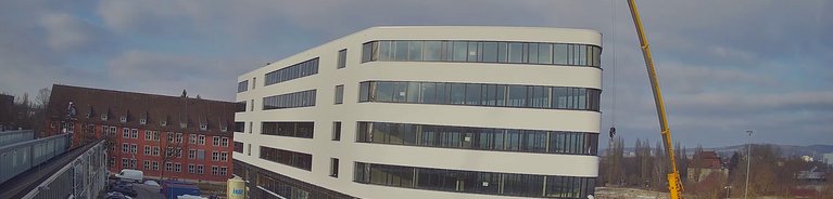 Der Bau des neuen Verkaufshauses in der Benzstraße 2 macht weiterhin große Fortschritte. Die Arbeiten an der Fassade sind fast abgeschlossen, der Rahmen des Vordachs wurde ebenfalls errichtet.