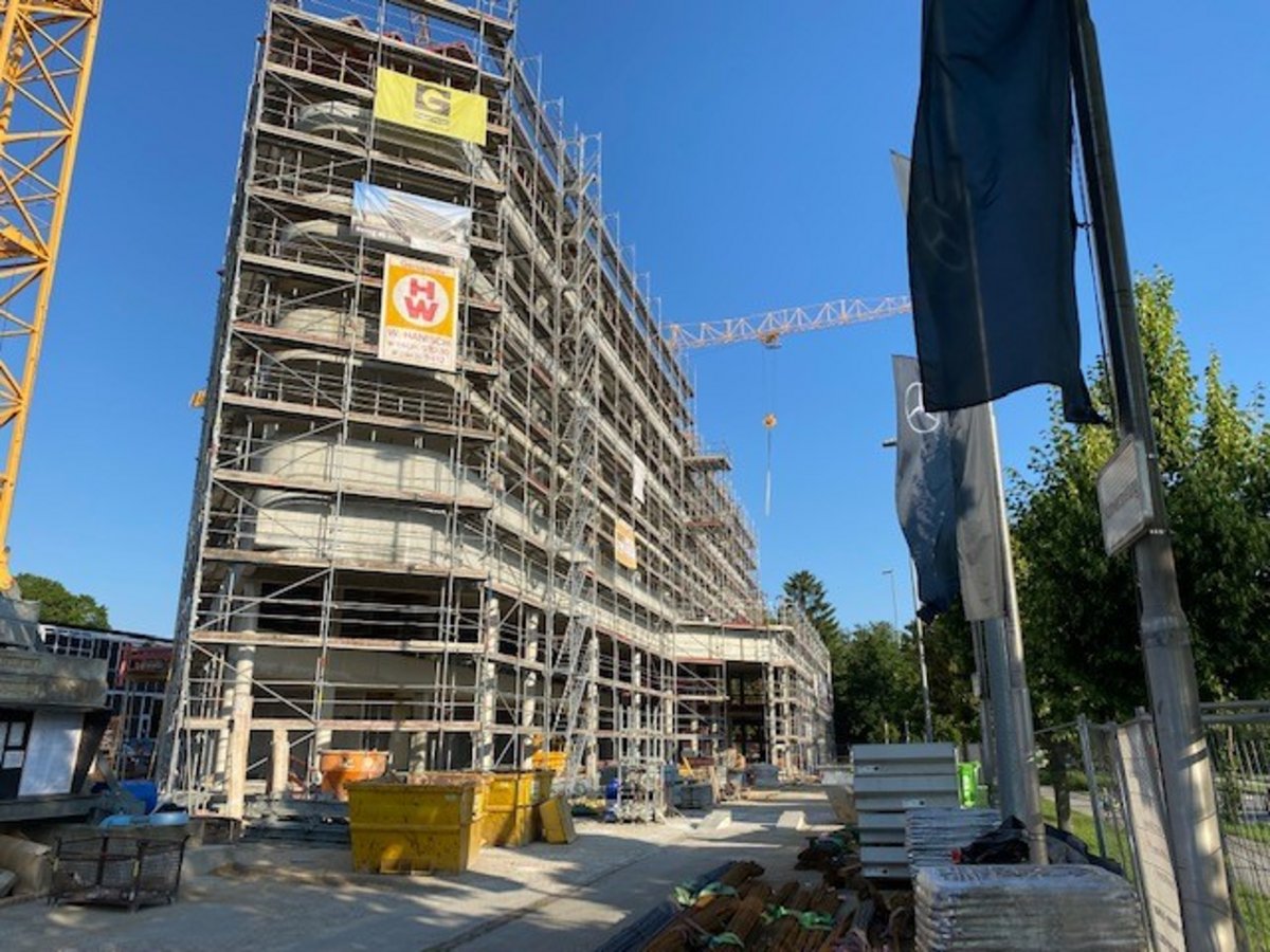 Im September fiel mit der Errichtung des Fassadengerüsts der Startschuss für den Fassadenausbau des neuen Verkaufshauses. Außerdem wurde das Flachdach fertiggestellt und mit der Errichtung der Innenwände begonnen.